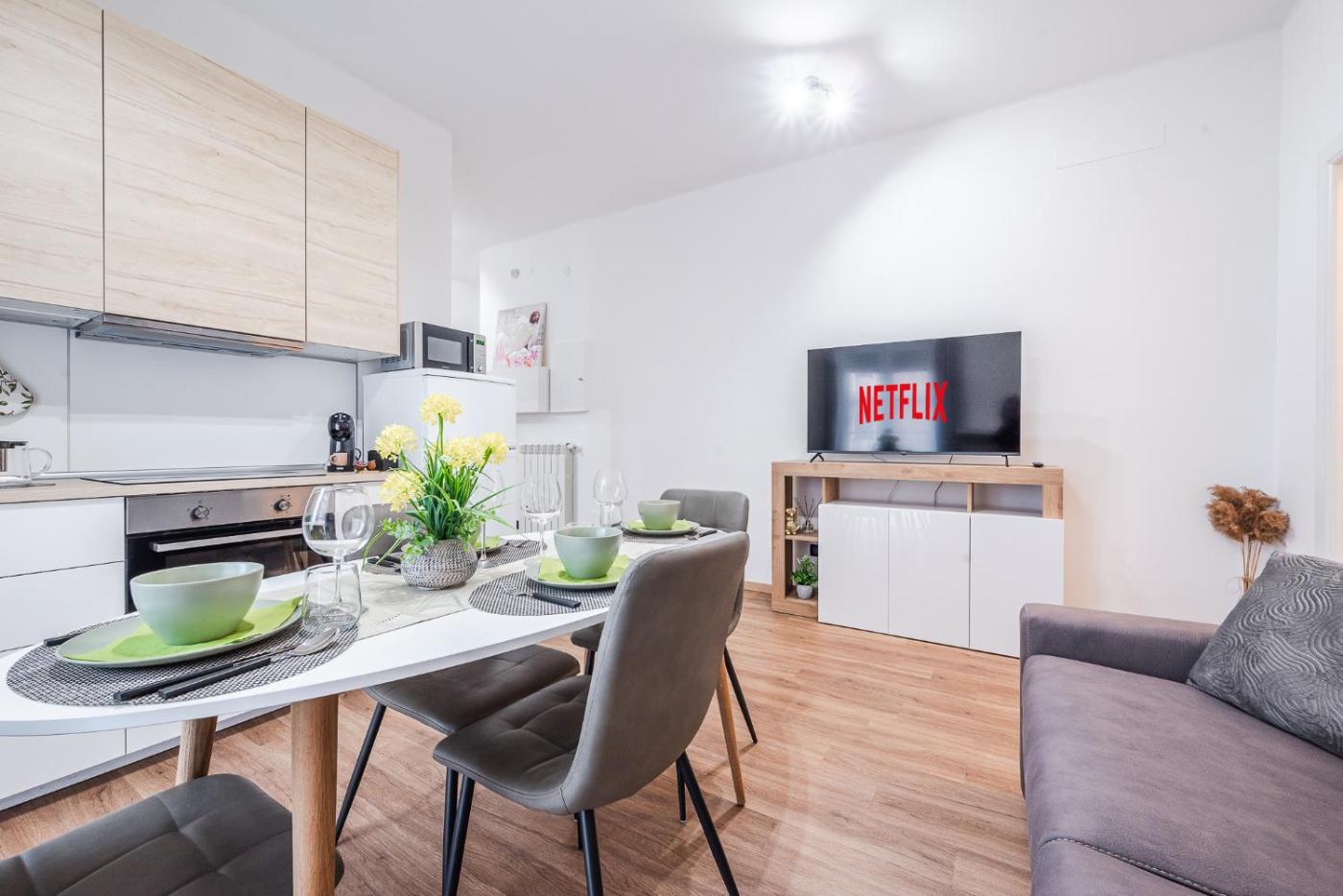 Two-Bedroom Apartment with Balcony. This spacious apartment is comprised of 1 living room, 2 separate bedrooms and 1 bathroom with a walk-in shower and free toiletries. In the kitchen, guests will find a stovetop, a refrigerator, kitchenware and an oven. The apartment offers a flat-screen TV with streaming services, a washing machine, a private entrance, a tea and coffee maker as well as city views. The unit offers 3 beds.